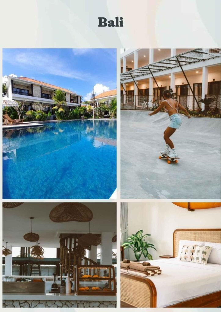 Kick off the trip at Kala Surf Camp, a stylish yet relaxed surf lodge tucked away near Uluwatu’s legendary breaks. With tropical gardens, a pool to cool off in after your session, and a social vibe that brings surfers together, Kala is all about comfort and community. Rooms are simple, clean, and cozy—exactly what you need to rest well and wake up ready for another day in the water.